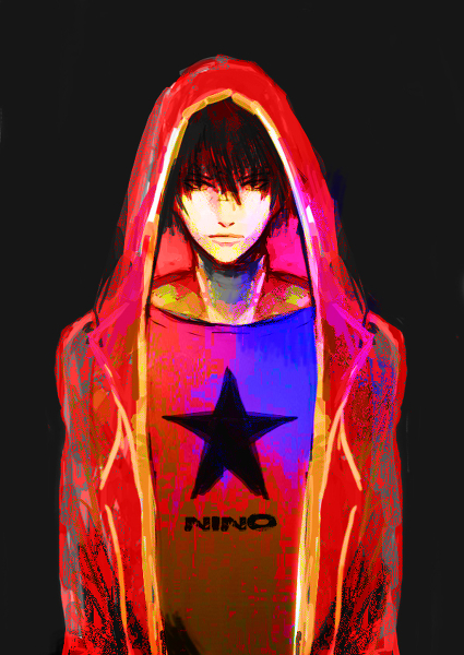 nino是我想努力画得冷酷帅气的一个家伙,但是冷酷=长刘海+帽兜这样的印象太深了,后来果断剪了他的头发,试试刚硬一点的方向也不错?被小监督提醒后决定试试以往不常画的东西。